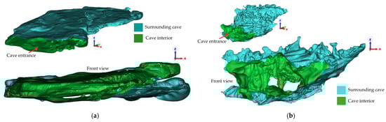 LiDAR-derived 3D point clouds of the surveyed cave sections used for propagation analysis: (a) Patihan Cave (sandstone) and (b) Chiang Dao Cave (limestone).
