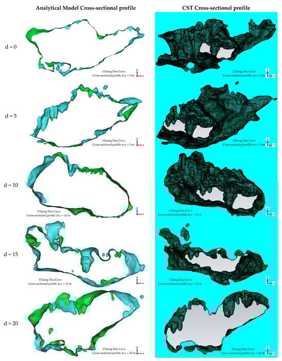 Comparison of LiDAR-derived analytical and CST-simulated cross-sectional profiles of Chiang Dao Cave along the Y-axis at d = 0, 5, 10, 15, and 20 m.