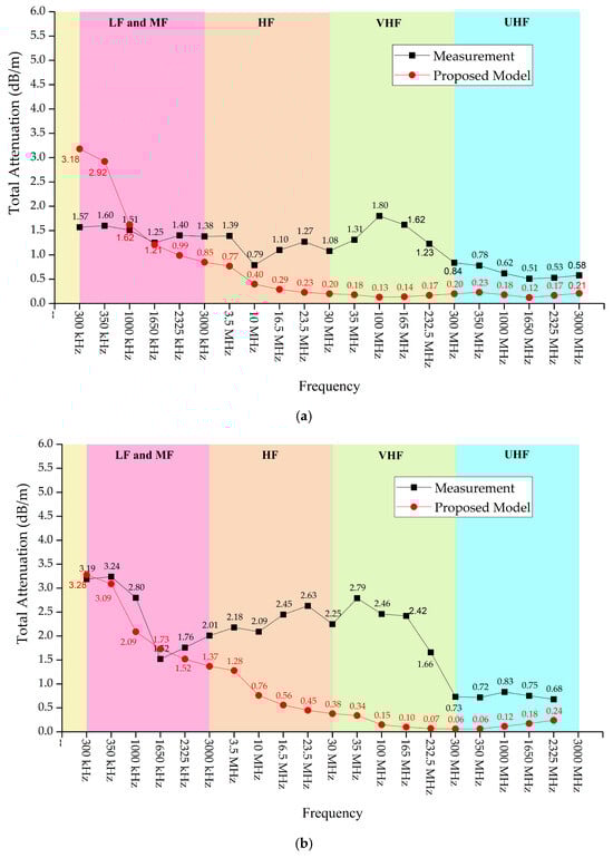 A quantitative comparison of the total attenuation derived from the measurements and the proposed model across multiple frequency bands provides additional insight into the level of agreement observed in Figure 12. In the LF, MF, and UHF bands, the total attenuation trends for both sandstone and limestone caves show strong consistency between the measured data and the analytical predictions, indicating good overall alignment. In the HF and VHF bands, small discrepancies are observed; however, these differences remain limited. For Patihan Cave (sandstone), the deviation in total attenuation does not exceed 1.67 dB/m, while for Chiang Dao Cave (limestone), the corresponding difference remains within 2.45 dB/m. Considering the inherent variability of natural cave geometries, measurement uncertainty, and frequency-dependent propagation mechanisms, these deviations can be regarded as moderate and acceptable. The results suggest that the proposed model is capable of capturing the dominant attenuation behavior across a wide frequency range, while minor discrepancies at intermediate frequencies likely arise from increased sensitivity to local geometric irregularities and multipath effects that are not fully represented in the analytical formulation. Although the observed signal attenuation in both caves is relatively low, the proposed model indicates higher attenuation at higher frequencies in the UHF band, which is consistent with previous studies conducted in this frequency range [7,8,10,11,14]. These studies report that as frequency increases, the influence of cave cross-sectional dimensions on attenuation becomes less significant, while attenuation due to wall roughness and wall inclination increases. This results in enhanced scattering and greater polarization reversal of the propagating waves [14].