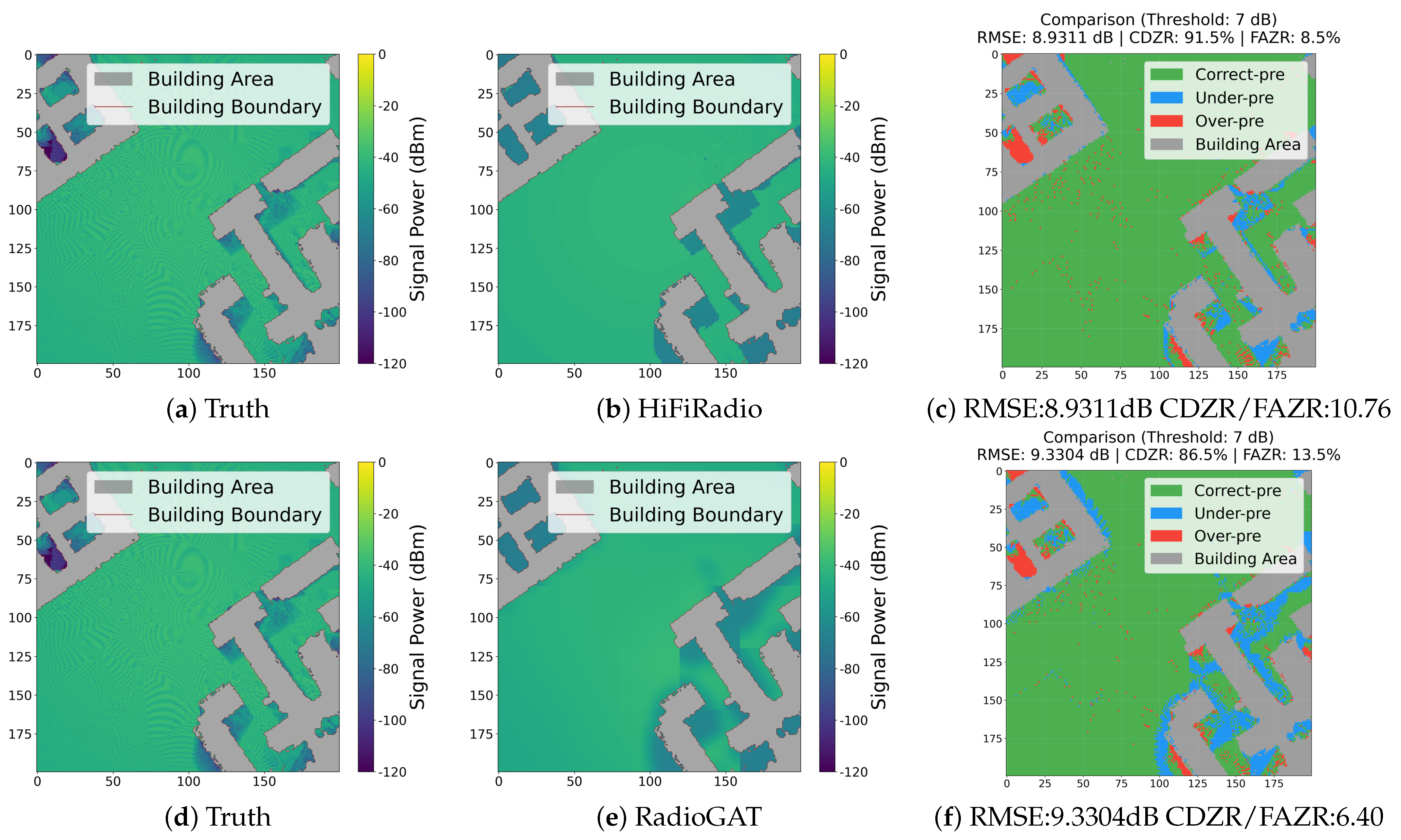 Comprehensive Experimental Validation: Using ray-tracing simulations grounded in real-world 3D environments, we benchmark HiFiRadio against leading model- and data-driven baselines, demonstrating superior performance. Furthermore, in situ RF measurements collected at the corresponding physical sites corroborate the framework’s operational reliability and efficacy.