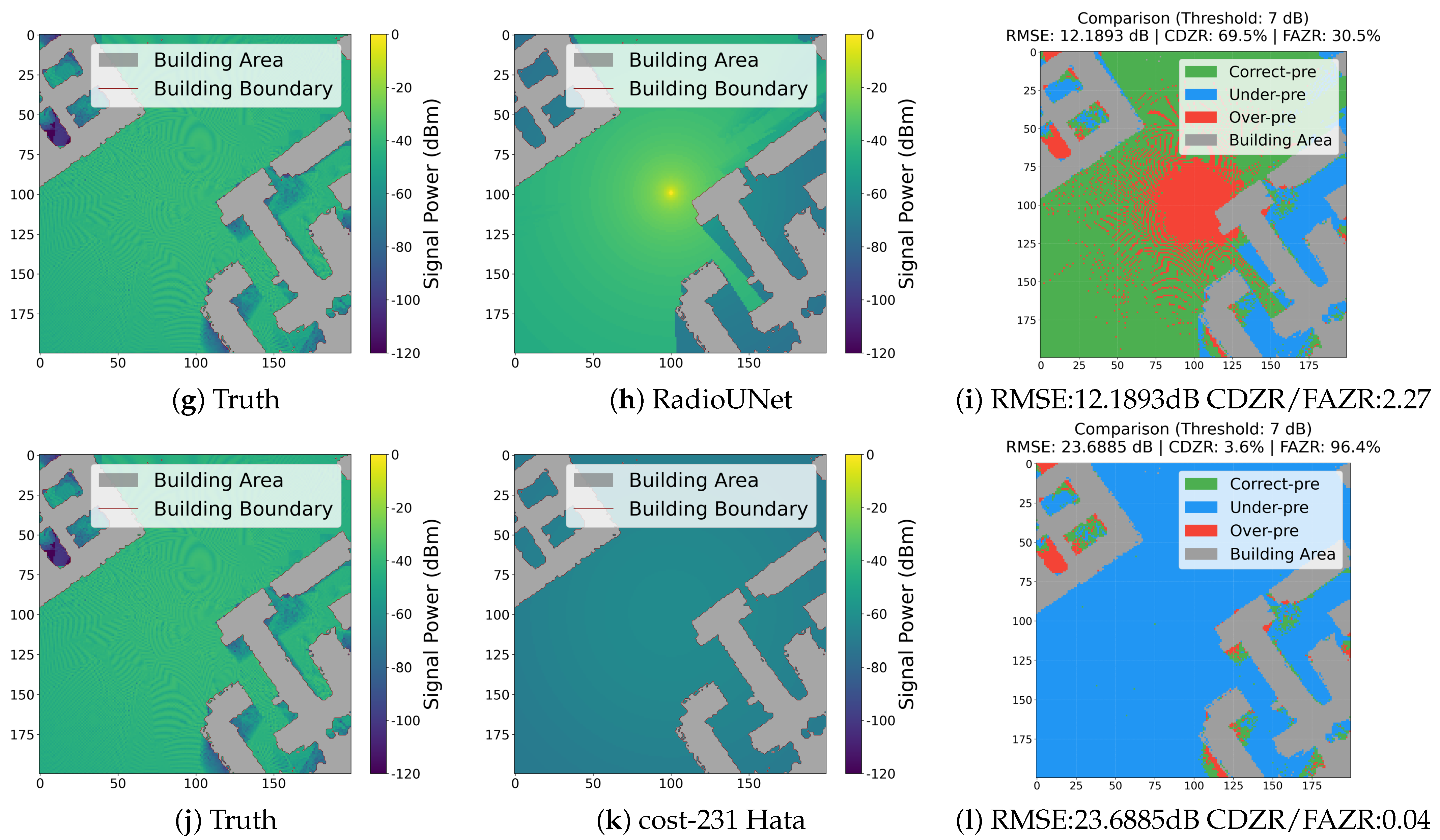 To quantitatively assess the accuracy, we generated the predicted radio maps for the entire area using both our HiFiRadio framework and the ray-tracing software Wireless Insite (version 3.3.2), using the same transmitter parameters and a receiver height of 1.5 m. We then compared the predictions against the field measurements. For a balanced evaluation, we randomly selected 500 sample points from each of the three propagation regions (LOS, NLOS, OLOS) identified in
