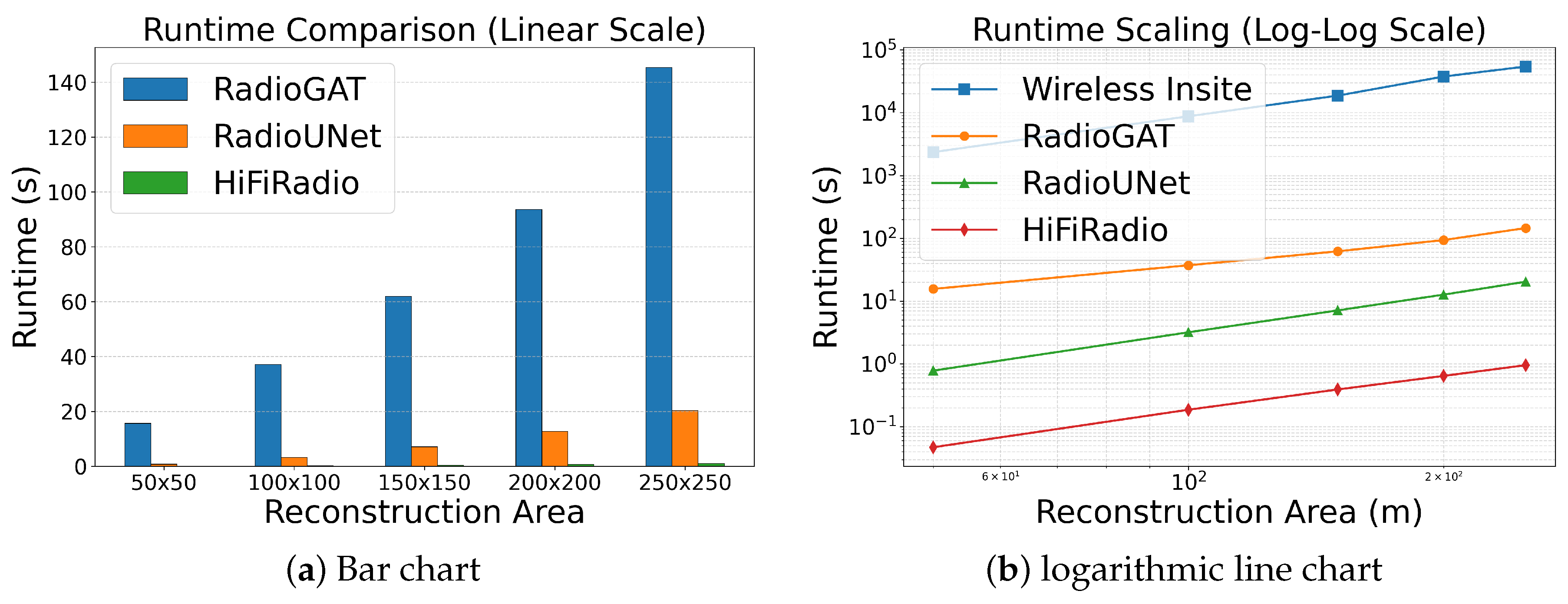 Favorable Accuracy–Efficiency Trade-off: Although HiFiRadio’s accuracy, particularly in complex NLOS and OLOS conditions, is lower than that of the dedicated ray-tracing simulator, the margin is acceptable. Crucially, this minor compromise in accuracy is made in exchange for a computational speedup of four to five orders of magnitude (as demonstrated in