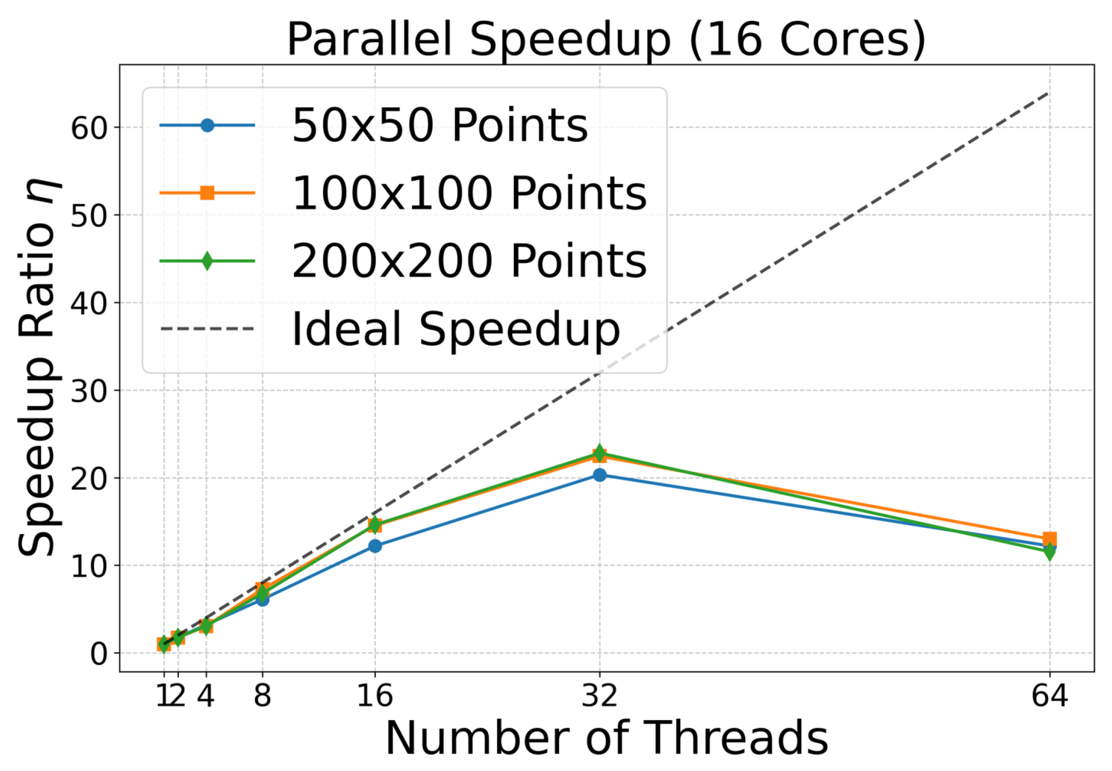 Performance Degradation Beyond Hardware Support: When the thread count (64) exceeds the number of available physical hardware threads (32 threads on our 16-core/ 32-thread test system), performance deteriorates. The runtime increases and the speedup ratio drops significantly (e.g., from 22.8× to 11.5× for the 200 × 200 case). This is due to the increased overhead of context switching and contention for shared resources among an excessive number of logical threads, confirming that optimal performance is achieved when the thread count aligns with the hardware’s parallel capabilities.