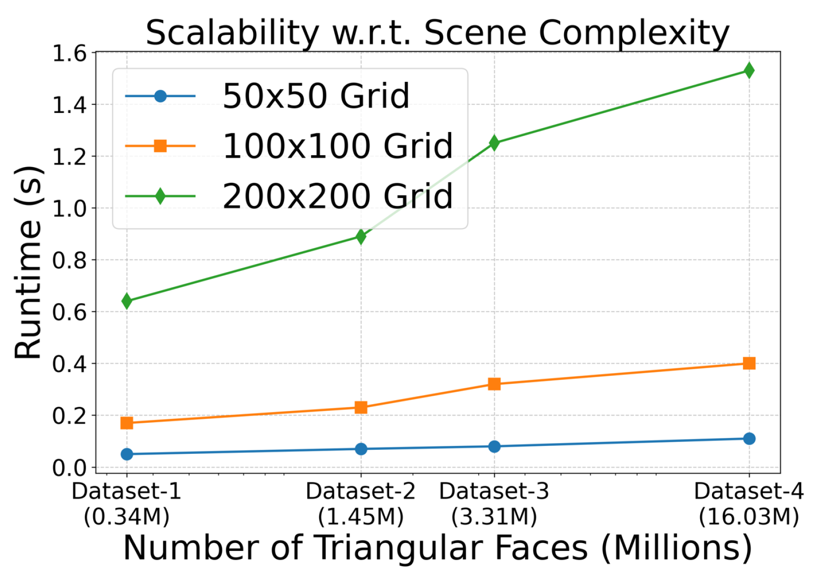 This highly favorable scaling is a direct consequence of the spatial indexing structure (R-tree) at the core of our framework. The R-tree organizes the massive mesh data in a hierarchical manner. During a ray query, the algorithm does not need to check every single triangle in the scene. Instead, it efficiently traverses the tree, quickly pruning away large branches of the hierarchy whose bounding volumes do not intersect the ray. This reduces the average time complexity of a single ray query from (checking all n triangles) to approximately .