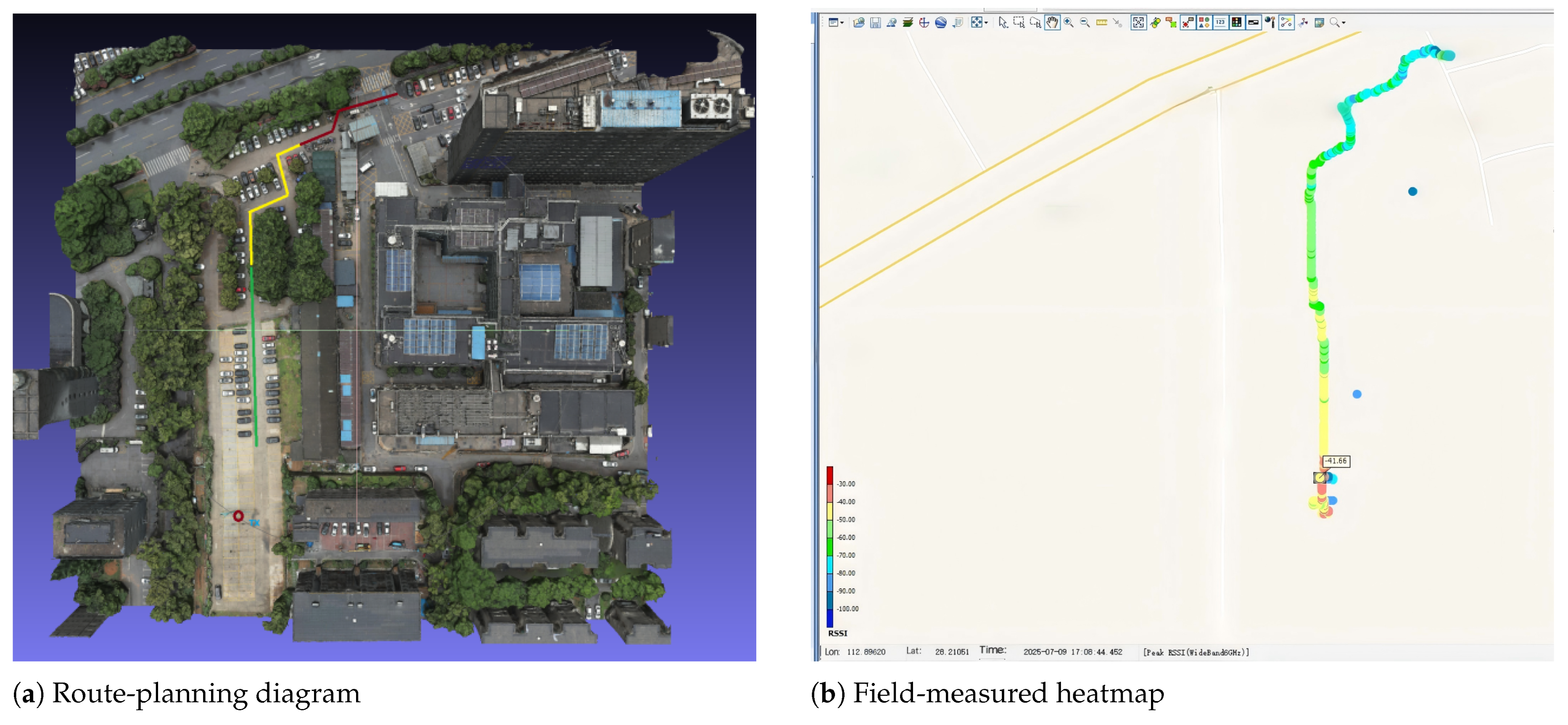 To further validate the accuracy of our proposed HiFiRadio framework in a real-world scenario, we conducted a field measurement campaign. Simulation-based validation, while valuable, can be influenced by model imperfections. In situ measurements provide the most credible ground truth for evaluating radio map reconstruction performance.