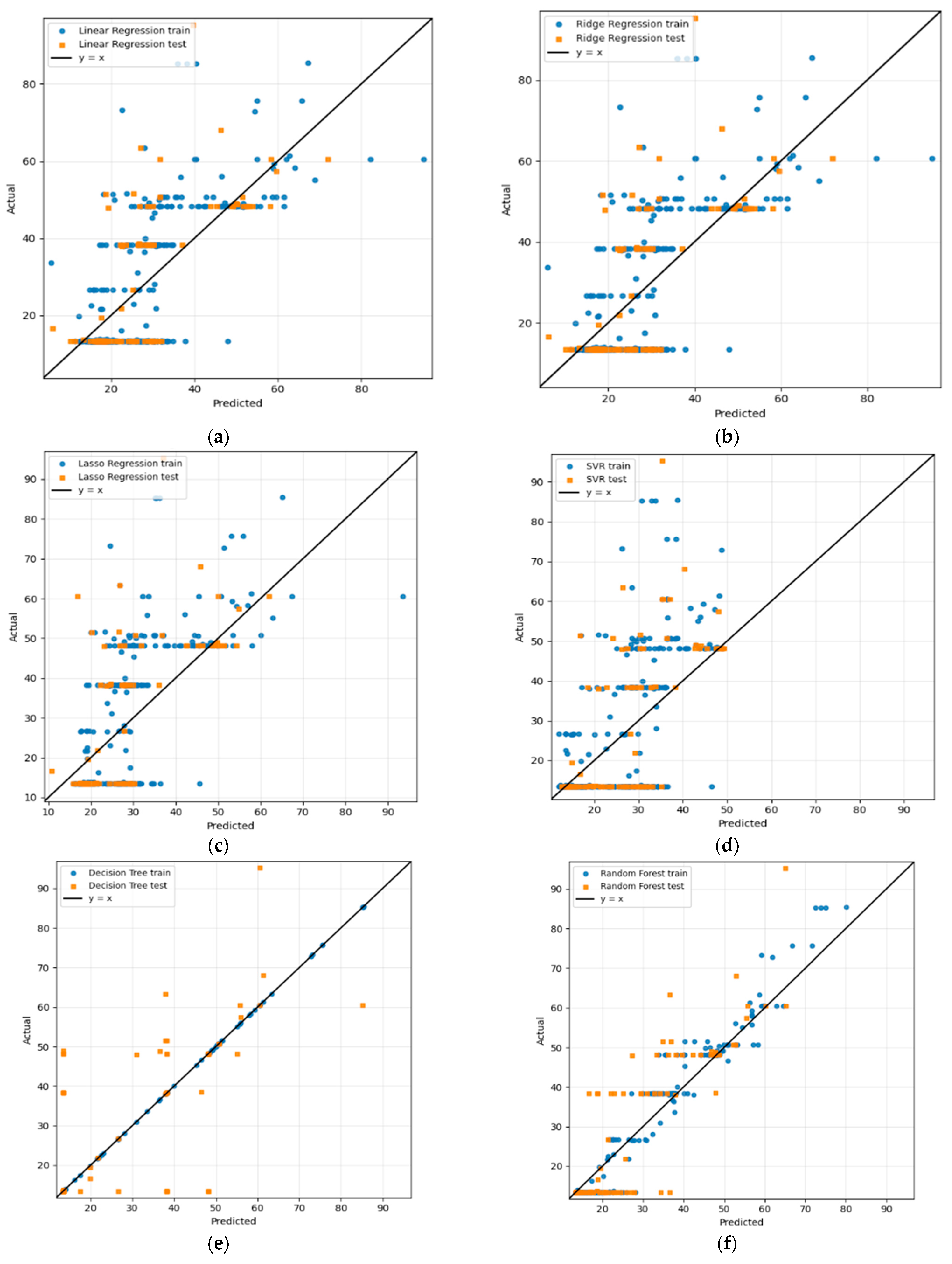 However, nonlinear kernel regressors (SVR) exhibit poor generalized behavior, with test predictions being widely dispersed around the parity line. Conversely, for tree-based regressors, the DT demonstrates strong overfitting with perfect alignment with the training data but scattered test predictions, while the RF demonstrates improved generalization, with test points more closely aligned along the 1:1 line.
