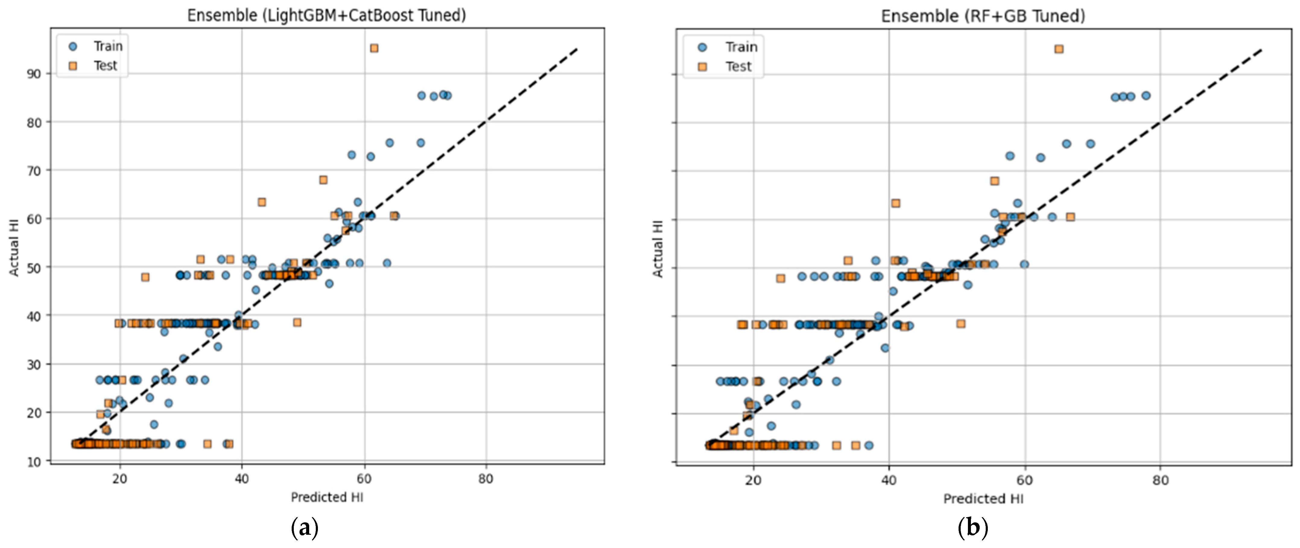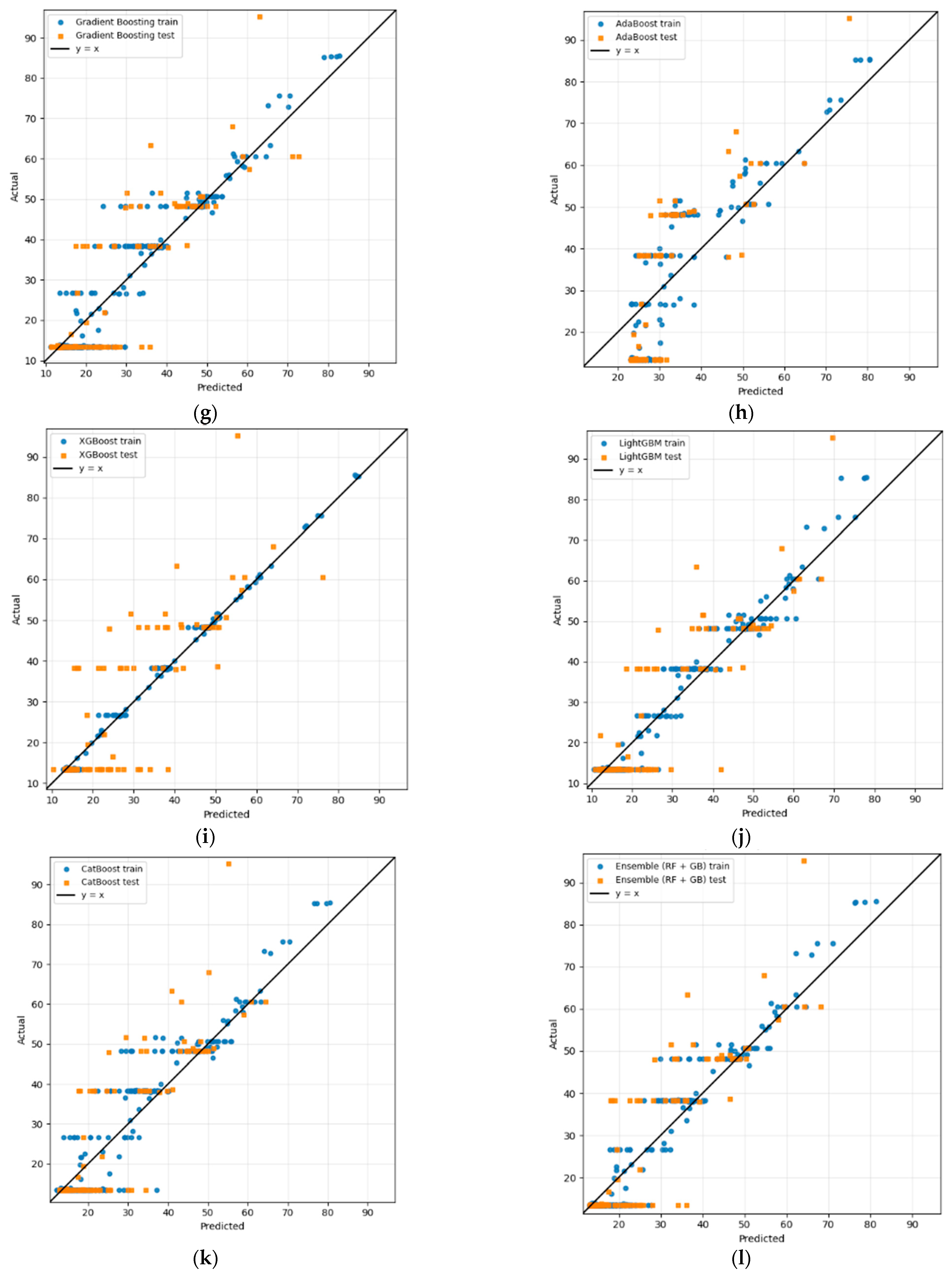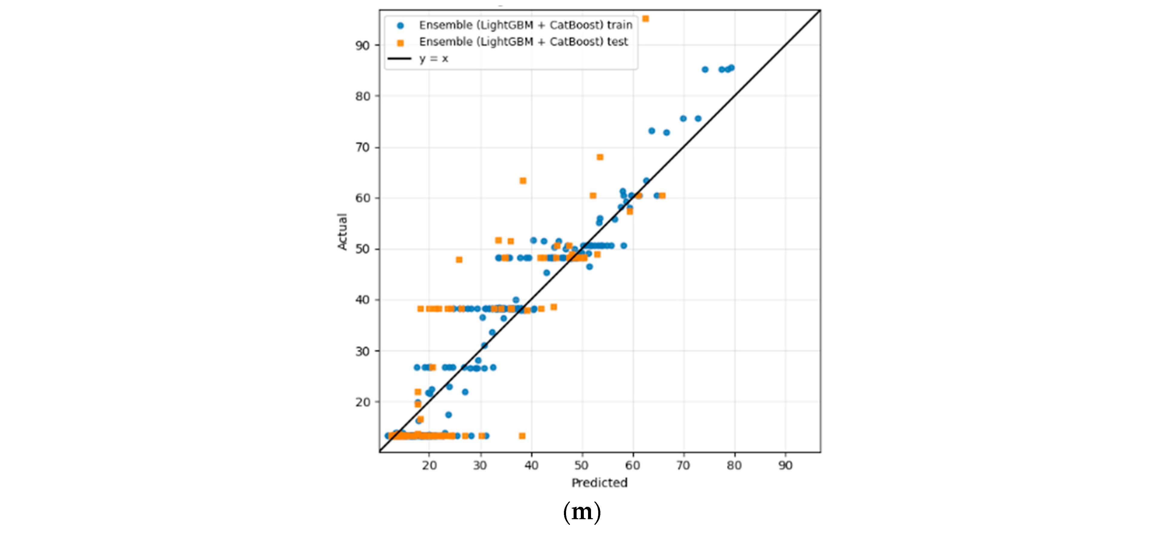 Figure 3l,m, based on a combination of individual learners, demonstrates the strongest visual agreement with the parity trend line. In the (LightGBM + CatBoost) ensemble, both training and test predictions are concentrated close to the diagonal, leading to the lowest overall errors. Likewise, the RF + GB ensemble attained improved alignment relative to its constituent models.