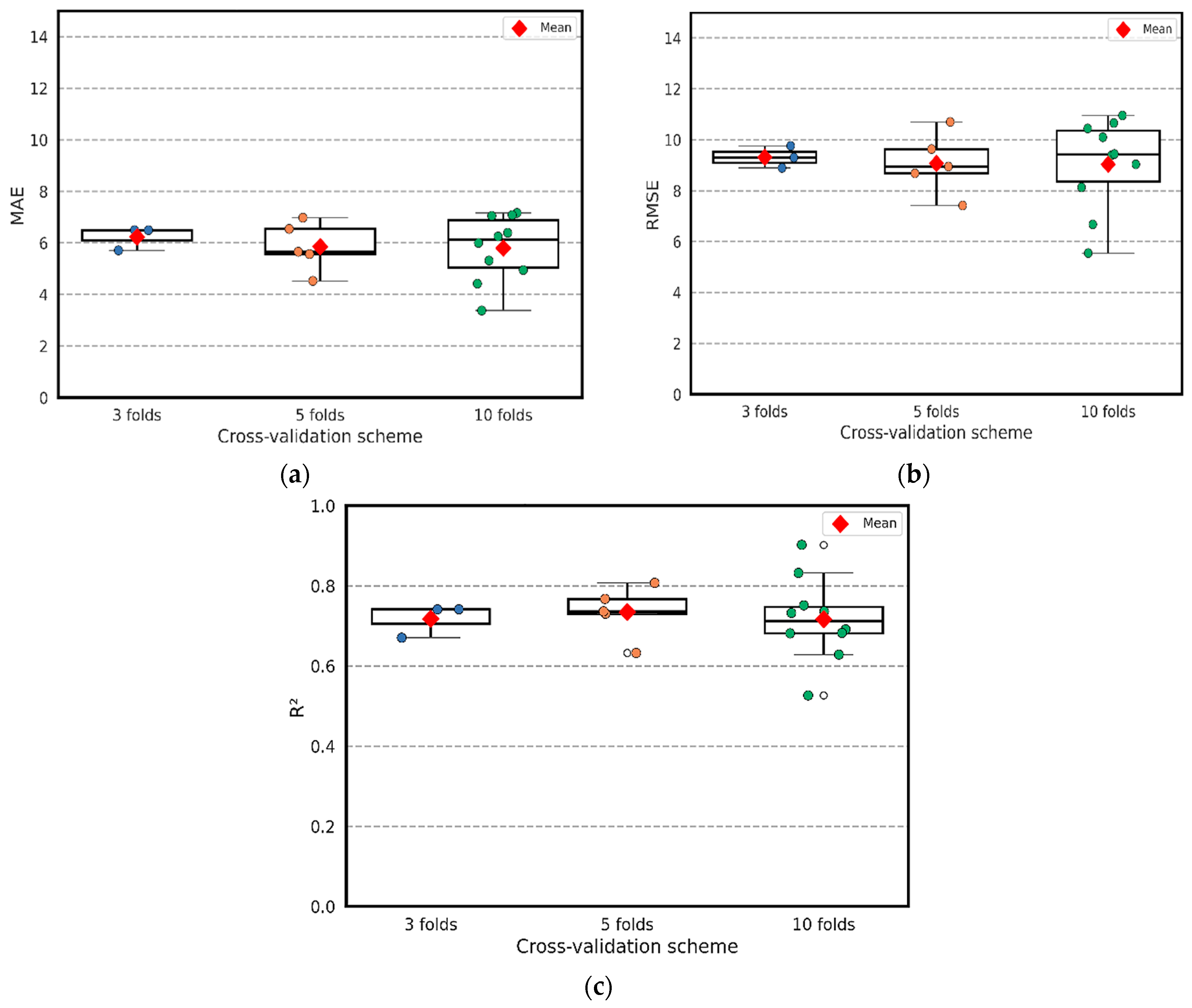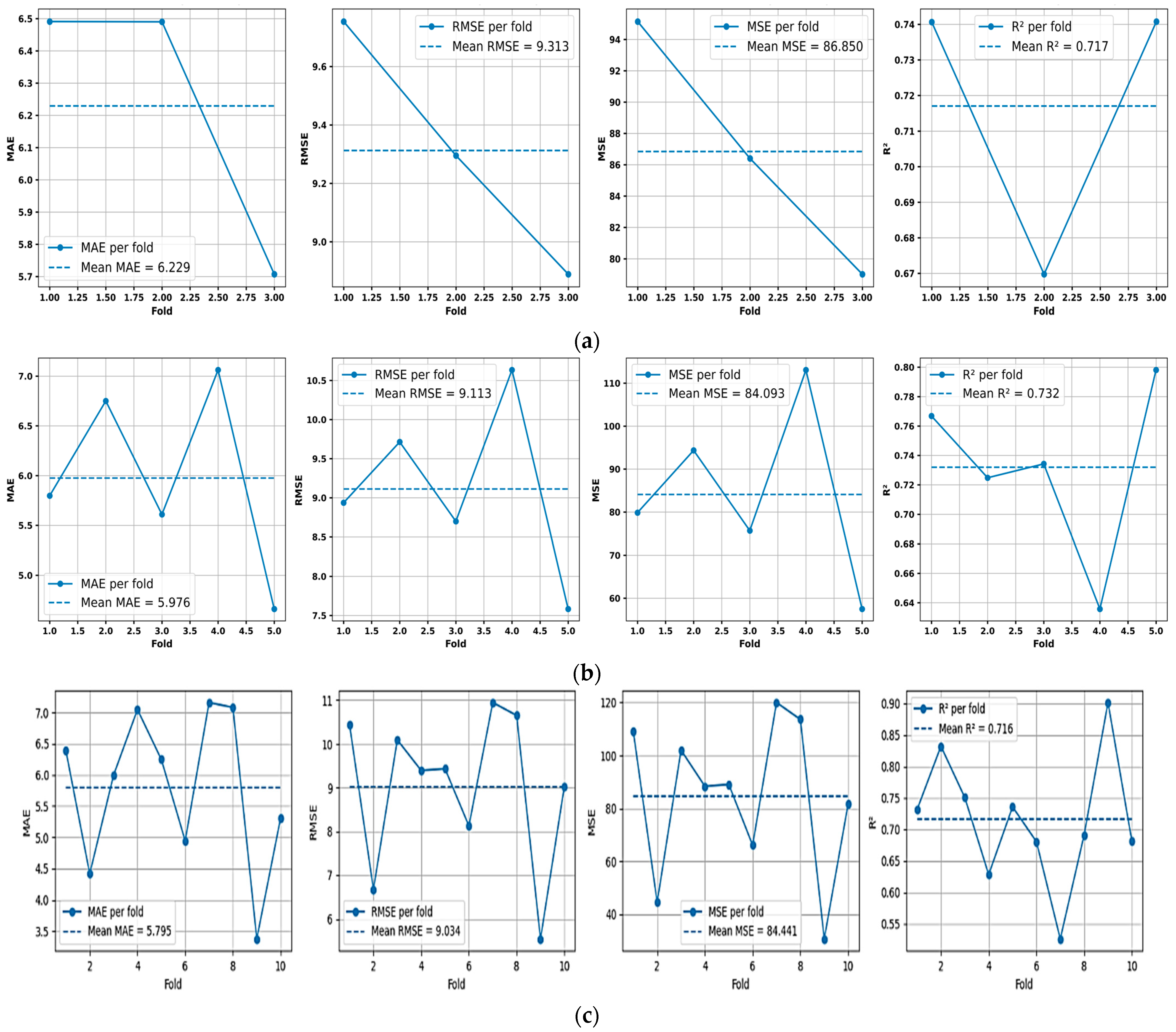 Figure 7b, with a slightly better average performance than the three-fold case. At five folds, the average MAE was depicted at 5.976, with an RMSE value of 9.113, and an R