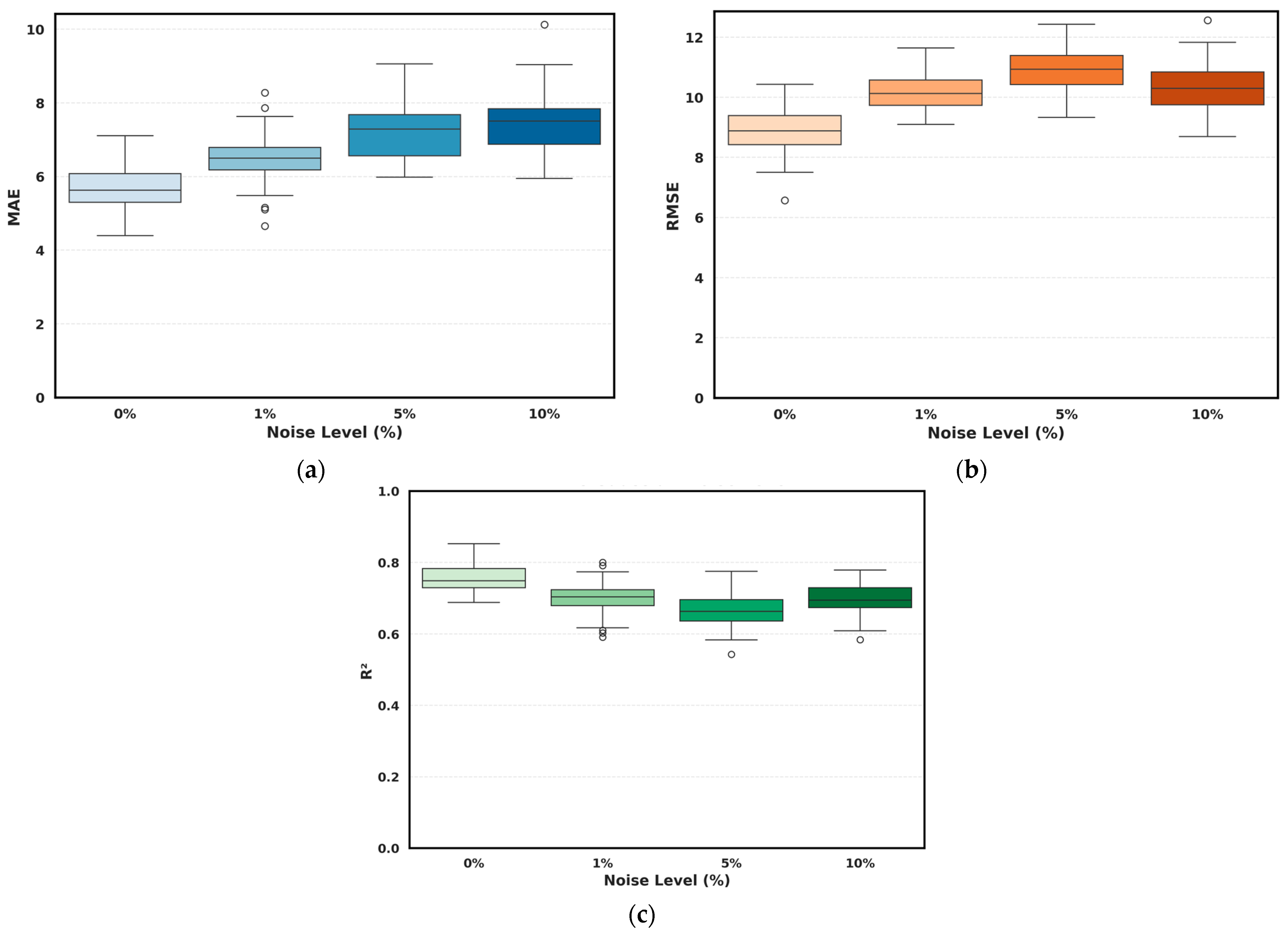 Figure 8 illustrates box-and-whisker plots for the MAE, RMSE, and R