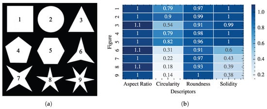 Comparison between commonly used morphometrics of different regular polygons of the same width and height: (a) Regular polygons labeled 1-9, (b) Heatmap of the corresponding values of Aspect Ratio, Circularity, Roundness, and Solidity for each shape.