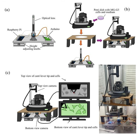 Experimental setup. (a) Modified Openflexure microscope; (b) coupling of the AFM and inverted microscope; (c) schematic representation, and photographs of the complete setup of the optical inverted microscope coupled with the AFM.
