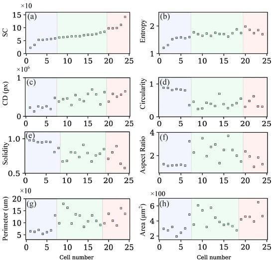 Morphological features measured for each cell shown in Figure 5: (a) shape complexity, (b) entropy, (c) cumulative difference (CD) in pixels, (d) circularity, (e) solidity, (f) aspect ratio, (g) perimeter, and (h) area.