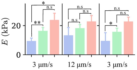 Median values of Young’s modulus for each cell group identified in Figure 5, for the three indentations, with colors indicating the group as in Figure 5. The loading rate corresponding to each indentation is indicated at the bottom of the graph. n.s. indicates non-significant differences (); * , ** .