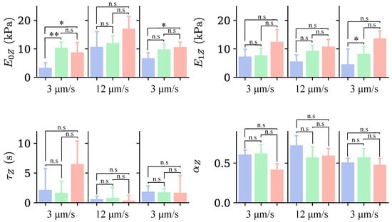 Median values for the parameters obtained from the curve fit with the FK model for each group of cells identified in Figure 5, for the three indentations, with colors indicating the groups of cells as in Figure 5. The loading rate corresponding to each indentation is indicated at the bottom of the graph. n.s. indicates non-significant differences (); * .