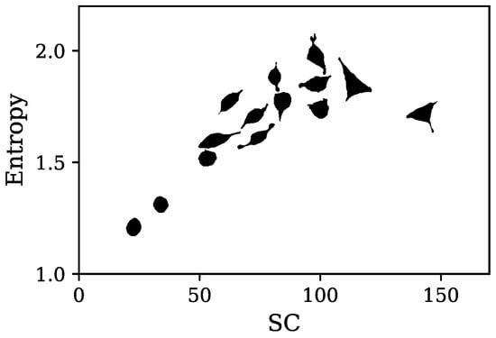 - Entropy is based on Shannon Entropy and represents the complexity of the outline. It increases with the simultaneous contributions of different harmonic modes and is defined as:where , for a given N number of modes analyzed [12].