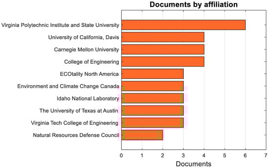 Figure 5 presents a compilation of publications on V2G systems in the Americas, categorized by affiliation. Virginia Polytechnic Institute and State University has the most documents with six. It is followed by the University of California, Carnegie Mellon University, and the College of Engineering, each with four documents. In third place is a group of five institutions with three documents each: ECOtality North America, Environment and Climate Change Canada, Idaho National Laboratory, The University of Texas at Austin, and Virginia Tech College of Engineering. Finally, in fourth place, with two documents, is the Natural Resources Defense Council.