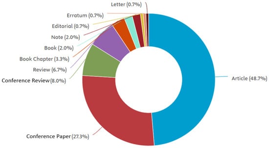 Figure 6 presents the documents by type. Articles account for 48.7%, conference papers for 27.3%, Conference Reviews for 8%, Reviews for 6.7%, Book Chapters for 3.3%, Book for 2%, Note for 2%, Editorial for 0.7%, Erratum for 0.7% and Letter for 0.7%.