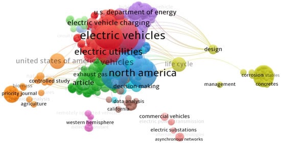 Figure 3 below shows the documents published by different countries, and it is not necessarily the countries of the Americas that have been driving their own development. It is evident that several countries outside the continent have been concerned with identifying development levels. It can be interpreted that the interest in their research may lie in understanding how the electric vehicle market is evolving and its applications related to the electrical grid. The United States has the highest number of publications, reaching 62, followed by Canada with 22 documents. A group of publications, not defined by country, occupies third place with 20 documents. In fourth place is China, a country outside the area of analysis, which underscores the significance of China’s potential interest in the Americas and its current and future contributions. Following this point, there are countries with fewer published documents, but their presence is still important.