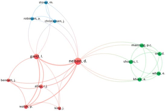 The number of authors and co-authors is 434, as shown in Figure 8. The analysis was performed by authorship and co-authorship, with a maximum of 25 authors per article. The most relevant researchers are Nelson D., Walsh P., and Alley R. J. Figure 9 identifies collaborations among the authors considered to have the highest number of publications in the field related to networked vehicles in America, who form a broad network for publishing their documents.