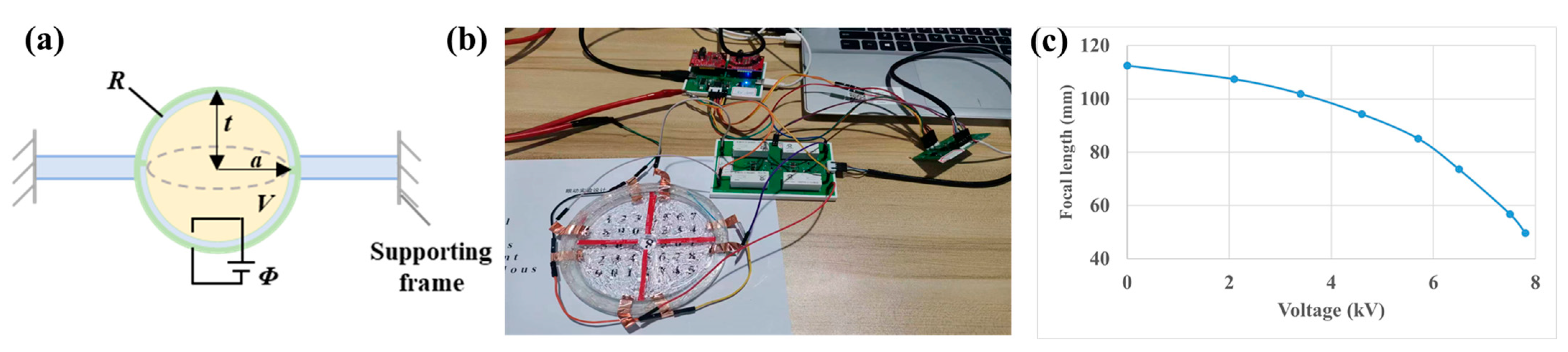 - Zhang, H.; Xia, Z.J.; Zhang, Z.S. Focus-tunable imaging analyses of the liquid lens based on dielectric elastomer actuator. Bull. Mater. Sci. 2021, 44, 148. [Google Scholar] [CrossRef]