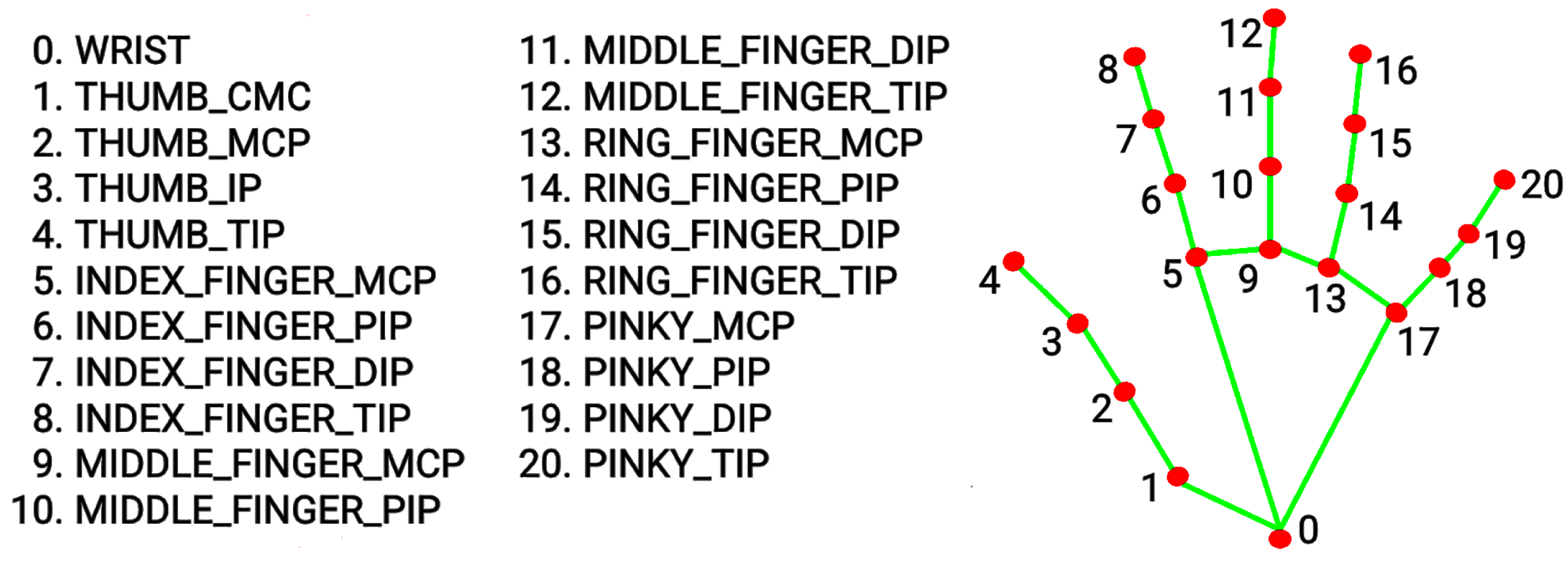 The MediaPipe Hands framework provides the foundation for hand detection and landmark estimation. The framework employs a two-stage pipeline: first, a palm detector locates hands in the input image; second, a hand landmark model estimates 21 3D keypoints representing finger joints and the wrist (