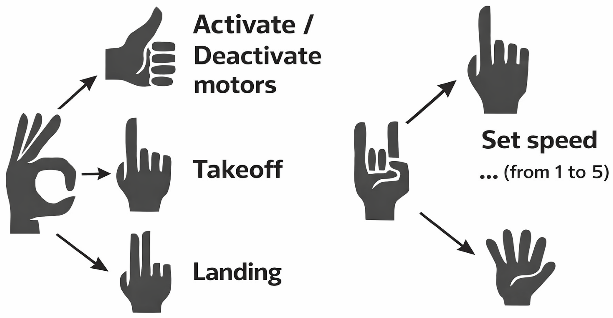 The current gesture vocabulary comprises eight static hand poses optimized for essential UAV control operations. However, the proposed architecture supports expansion to more complex gesture sets:
