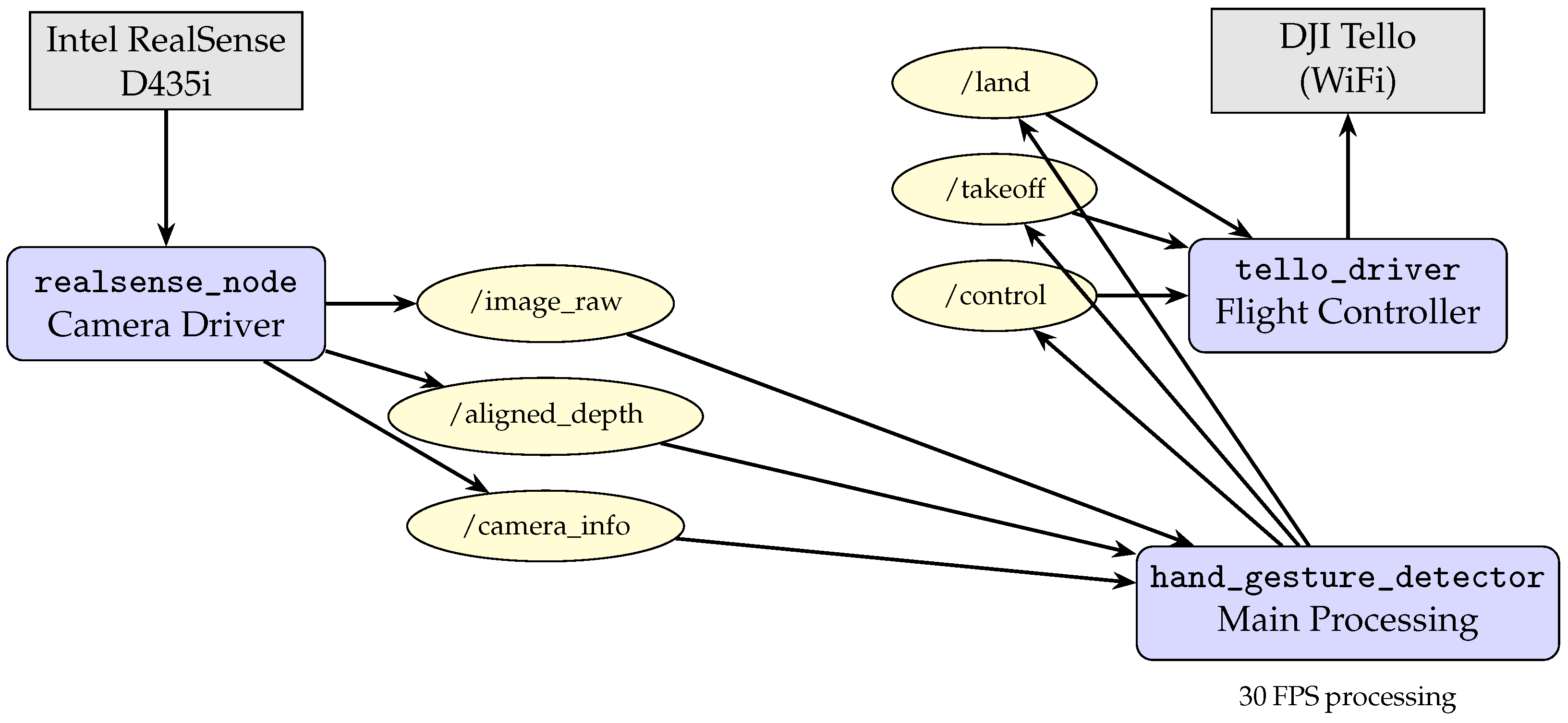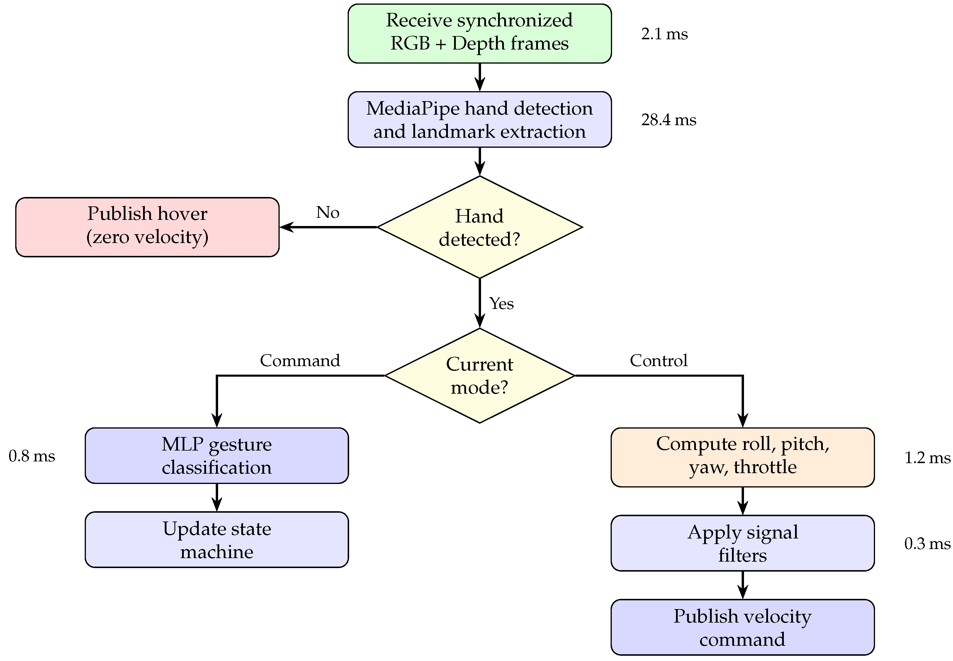 HandGestureDetector) that subscribes to camera topics and publishes velocity commands. Gesture recognition is performed on every incoming frame from the depth camera stream, synchronized with the RGB stream at 30 FPS. This frame-by-frame processing approach, rather than temporal aggregation or periodic sampling, ensures maximum responsiveness to operator commands, while the filtering pipeline (