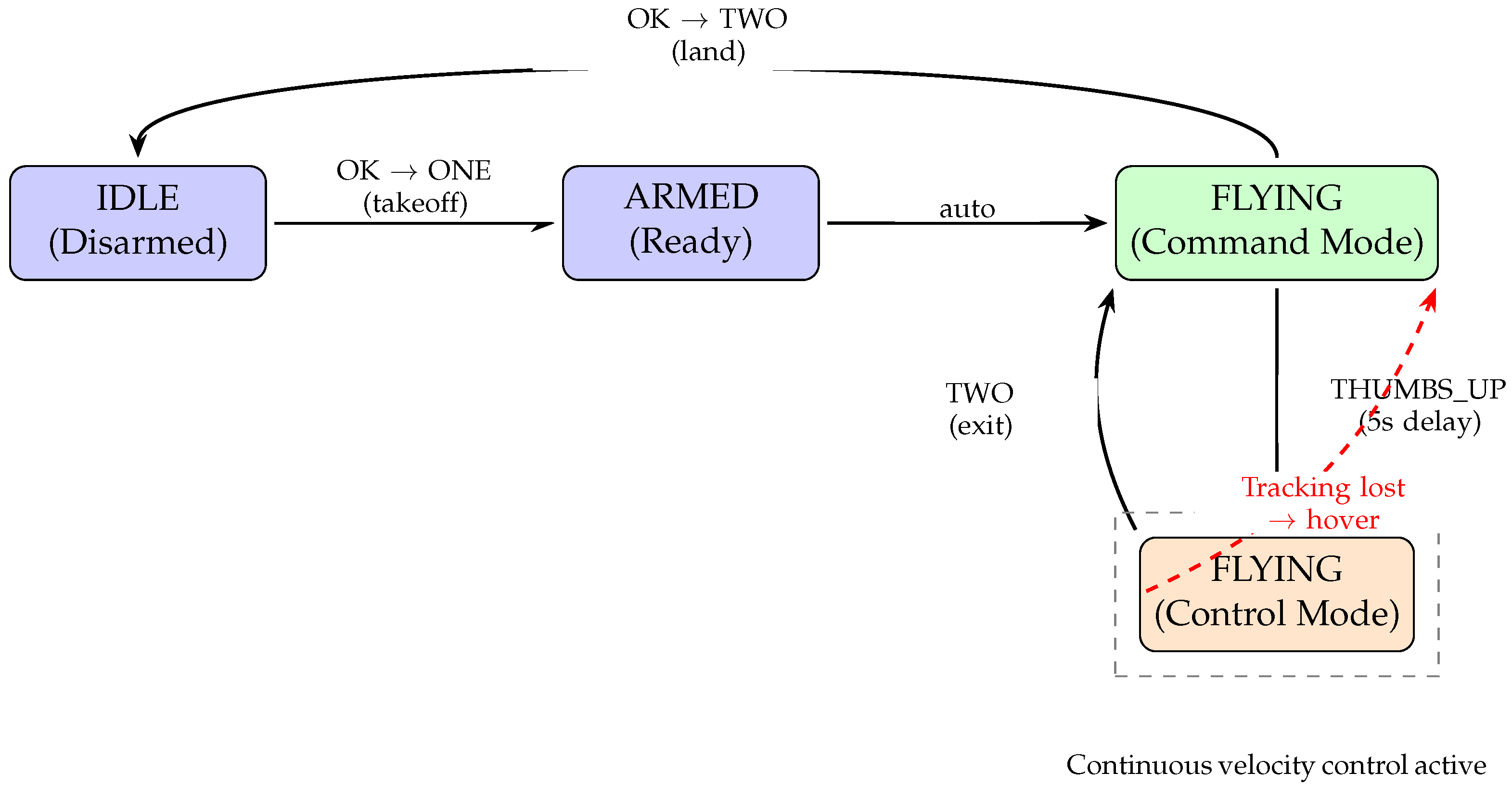 The hierarchical control architecture addresses a key limitation of existing systems by separating discrete commands from continuous control. Gesture sequences for safety-critical operations (takeoff, landing) prevent accidental activation, while the continuous control mode enables precise maneuvering. This design pattern may be applicable to other robotic systems requiring both high-level mode switching and fine-grained control.