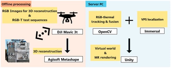 This system is an extension of the MR framework established by Kinoshita et al. [20]. In the method of Kinoshita et al., absolute position (Localization) is periodically estimated by RGB-based VPS using a pre-constructed 3D map, and the gaps between VPS updates are complemented by natural feature point tracking (Tracking) of RGB images. While following this basic structure, the proposed method extends the local tracking process from monocular RGB to RGB-Thermal parallel tracking. The system acquires synchronized footage from RGB and Thermal cameras mounted on the drone and performs processing in the following two loops: