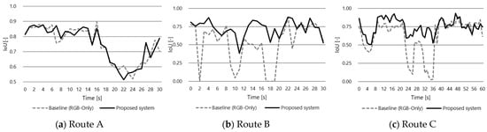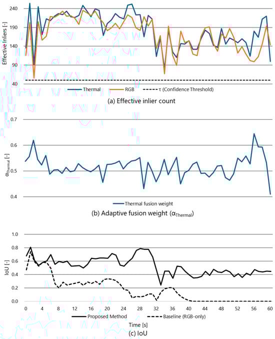 In addition to system-level research, fundamental performance evaluations of thermal features have also been conducted. Johansson et al. [39] and Mouats et al. [40] conducted comprehensive benchmarks of feature point detectors and descriptors for thermal images. According to their evaluations, it is reported that combinations of Oriented FAST and Rotated BRIEF (ORB) and Fast Retina Keypoint (FREAK) or Binary Robust Invariant Scalable Keypoints (BRISK), or combinations of Speeded Up Robust Features (SURF) and FREAK, show relatively good performance. However, they also concluded that matching using visible light images was still superior under conditions with good visibility and sufficient texture. This suggests that while thermal features are robust against illumination changes, they have lower discriminative power compared to RGB features under standard environments, supporting the view that thermal images should not simply replace RGB but adaptively complement it.