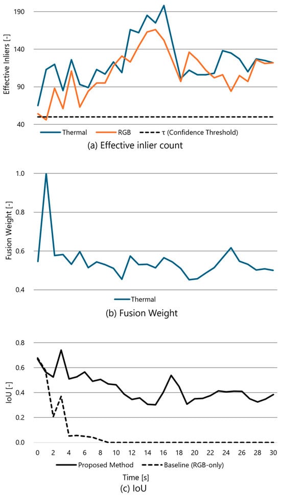 to the sensor with a larger effective spatial distribution (), the system actively suppressed the influence of the modality suffering from tracking instability (e.g., due to texture loss or thermal equilibrium), thereby ensuring robust trajectory estimation.