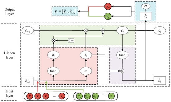 In Figure 1, , , and represent the input to the input layer, output layer, and current state information of the BiLSTM, respectively. They can be expressed as: