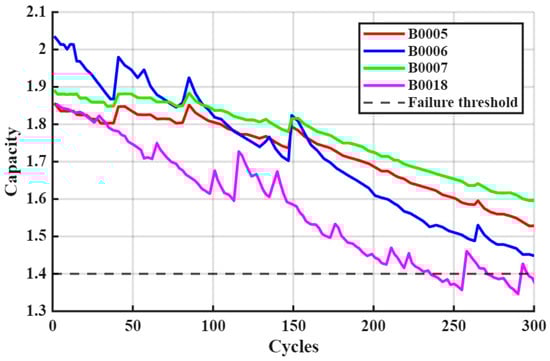 To validate the accuracy of BiLSTM-GPR predictions, this study employs lithium-ion battery datasets from NASA’s Center of Excellence for Prediction data repository [37], selecting datasets B5, B6, B7, and B18 for experimentation. Battery cycling comprises three processes: charging, discharging, and impedance testing [38]. Initial capacities vary across datasets: B5, B6, B7, and B18 have initial capacities of 1.86 Ah, 2.04 Ah, 1.89 Ah, and 1.86 Ah, respectively, with rated capacities uniformly set at 2 Ah. Capacity changes during battery discharge cycles are illustrated in Figure 3.