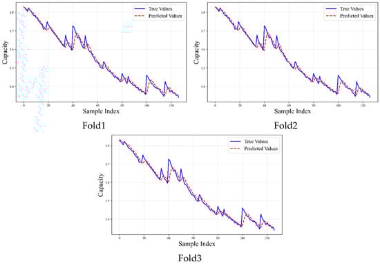 This paper selects the charging curves of V and I as input features, taking 10 samples from each curve and averaging them. Data normalization is performed using maximum–minimum scaling. A sliding window method is employed to construct input–output sequence pairs, with a window length of 5. A window length that is too short may hinder the model’s ability to capture battery degradation trends, while an excessively long window introduces noise and increases the risk of overfitting. The sliding step size is set to 1, and regularization is applied to mitigate overfitting. The comparison results between the model’s predicted capacity and actual capacity are shown in Figure 4.