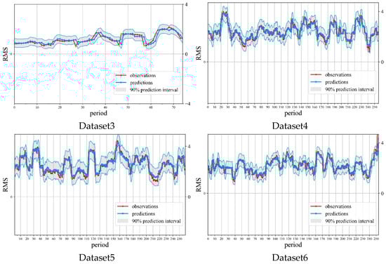 As shown in Table 7, the point prediction results of the model remain at a low level across Datasets 1–6, further validating the high-precision point prediction capability of BiLSTM-GPR on different datasets. Among them, Dataset 2 exhibits the optimal point prediction performance, while Dataset 3 shows relatively higher error, potentially attributed to greater fluctuations in input features or noise interference. To further assess prediction uncertainty, the model’s interval predictions at the 95% confidence level and continuous graded probability scores were calculated, as shown in Table 8.