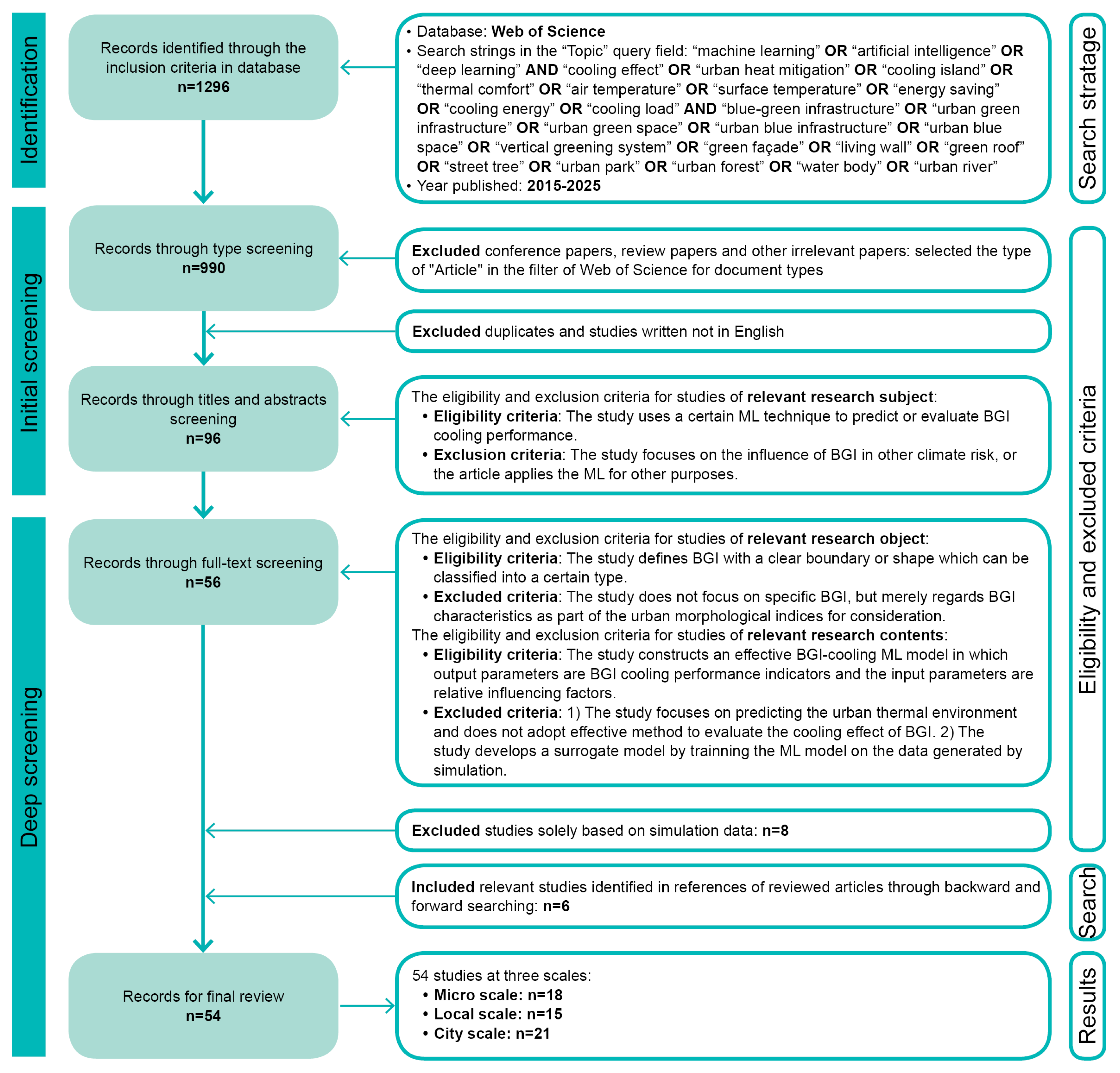 - Cooling effect: “cooling effect” OR “urban heat mitigation” OR “cooling island” OR “thermal comfort” OR “air temperature” OR “surface temperature” OR “energy saving” OR “cooling energy” OR “cooling load”.