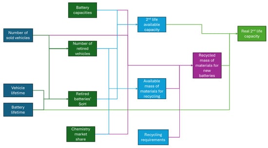 The rest of the paper is structured as follows: Section 2 presents in detail the proposed methodology, the flowchart of recycling, the second-life decision process and the batteries’ SoH and lifetime distribution; Section 3 describes the analyzed case studies, proposing four scenarios regarding the number of EV sales, as well as the considered evolution of battery capacity and chemistry market share; Section 4 illustrates the results, the estimations made for all four scenarios, containing the annual battery retirements, recyclable material masses, usable second-life capacity after recycling requirements and the distribution of the second life batteries; Section 5 presents an economic analysis that indicates the scenario with the highest revenue obtained as a result of battery cascading use and recycling, and finally, Section 6 highlights the study’s conclusions.