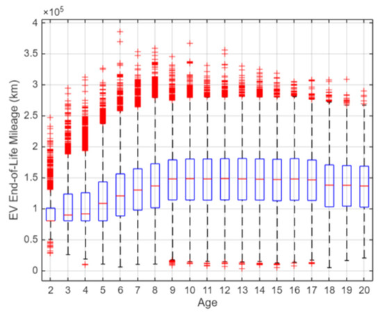 Based on the EV’s chassis and battery limitations, the vehicle’s lifetime and retirement year are determined. The boxplot presented in Figure 3 indicates the EoL mileage of EVs based on their retirement year. As can be observed, the median mileage increases steadily in the first 9 years, followed by stagnation for the next few years and then a slow decrease. These later failures are observed among lighter EV users, where EVs reach technical or economic EoL around a similar mileage threshold, while earlier failures are likely due to manufacturing errors. Moreover, the interquartile range, illustrated by the height of the box, represents the spread of the central 50% of the data and increases with age in the first years. The outliers (red crosses) are predominantly high-mileage ones and earlier failures, which are likely due to high usage, like taxis or fleet vehicles. From this point, the annual battery retirements, number of EVs in operation and retirement rate by manufacturing year can easily be determined.