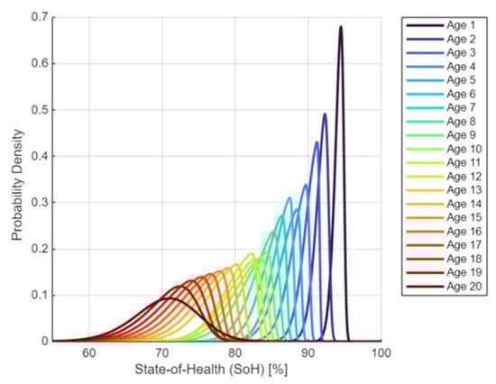 Another important parameter is retired batteries’ SoH. It influences their suitability to be reused in second life applications, like battery energy storage systems. The results regarding the SoH distribution for different retirement ages of EV batteries are extracted from the model developed by Fallah et al. [19]. They are presented in Figure 4 and show that early retirements still have a good SoH, influenced by lower median mileage, and a narrow distribution, due to short available usage time to create a meaningful impact. It is also noted that the rate of decreasing SoH slows down with age, caused by similar EoL mileage values, from the age of 9 onwards but maintains a descending trend, due to the impact of age itself on the SoH of LIBs.
