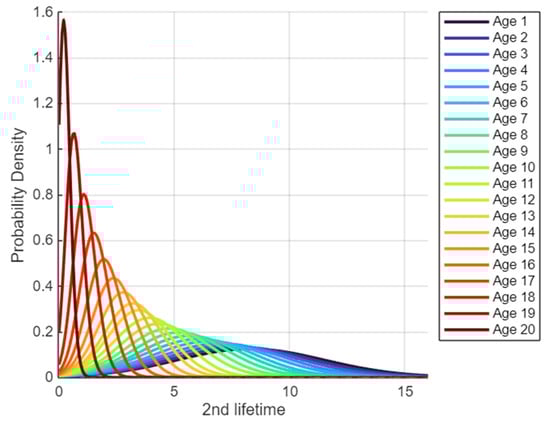 The reused EV batteries have a limited lifetime in second-life applications, which, according to the model developed by Fallah et al. [19], depends on the age of the EV’s retirement. In Figure 5 the results of second lifetime distribution for different retirement ages of EV batteries is presented. As it is shown, each battery has a limited total lifetime, after which it is recycled. The recycled materials may be reused in the construction of future EV batteries, supporting the circular economy.