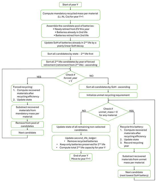 Then, the vector containing the gap of required mass is initialized by being made equal to the remaining mandatory mass for each material. All remaining candidates are sorted based on their SoH, after their first life. Therefore, the lowest SoH candidate is the first one to be retired and recycled, followed by the update of the unmet mass per material. This step is repeated until the mandatory recycling mass per material for the following year (Y + 1) is met. Once the yearly mandatory recycling mass target is reached, the candidates’ status is updated following the proposed framework presented in Figure 7. The updated structure allows for the evaluation of the already existing second life batteries and the estimation of the annual storage capacity that becomes available, as well as several statistics regarding its composition (function of capacity, SoH, age, chemistry etc.). This can be of great interest when considering the compatibility of the numerous individual batteries when trying to integrate them into one single, large stationary energy storage system, as well as the upcoming challenges regarding the management of the system [13].