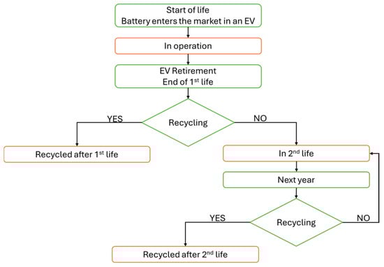 At the end of the primary life, a decision must be made between repurposing the battery for a second-life application or recycling it. Figure 6 presents a flowchart regarding the decision process, while the battery state flowchart is presented in Figure 7, where four possible states are identified for the battery: in operation, being used in the primary life, recycled after the first life, repurposed for a second-life application and recycled after the second life.