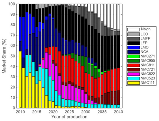 Other chemistries such as lithium cobalt oxide (LCO), lithium manganese oxide (LMO) and nickel-cobalt-aluminum (NCA) are slowly exiting the market due to multiple disadvantages related to their energy density, cycle life, thermal instability or high ratio of critical raw materials. Nickel-manganese-cobalt (NMC) chemistries, due to their high energy density, are still expected to play an important role in the market. A shift can be observed from chemistries that require a higher cobalt content (NMC111, NMC523) towards higher nickel and manganese concentrations (NMC955, NMC811, NMC721) [26,46].