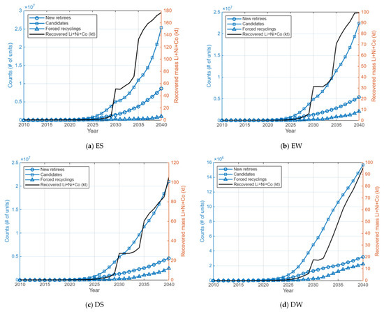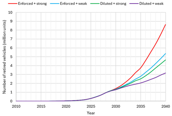 The scenarios considered influence the number of retired vehicles, as presented in Figure 11, as well as the number of EVs on the road. The prediction of retired EVs, in the four scenarios, for 2040 are the following: for the scenario Enforced + Strong (ES) 8.62 million units, for Enforced + Weak (EW) around 5.36 million, for Diluted + Strong about 4.64 million and for Diluted + Weak (DW) 3.18 million.