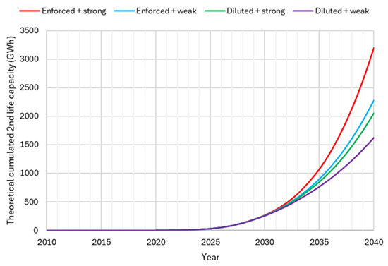 The cumulated second-life capacity is presented in Figure 12 and is determined as the sum of the retired batteries each year multiplied by their corresponding SoH at retirement. These are the theoretical values if all batteries enter second life with no degradation. These results underline the importance of adopting electric mobility early, since the delay propagates in the second life availability and, therefore, hinders the capacity to store the energy surplus produced by renewable sources.