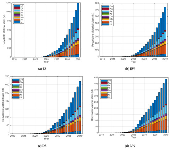 Annual potentially recyclable material mass by element in: (a) ES; (b) EW; (c) DS; (d) DW scenarios.