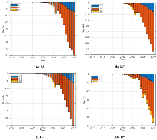 Annual gap between required and recovered mandatory materials in: (a) ES; (b) EW; (c) DS; (d) DW scenarios.