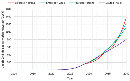 Figure 17 illustrates the usable second-life capacity, after the mandatory recycling requirements are met. It can be observed that there are no notable differences for usable second-life capacity between the four policies until 2029, despite the fact that the number of vehicles sold differs. It is attributed to the first batteries, with life potential, that are recycled to meet the EU regulation starting 2030. Given the considerably higher recycling demand, the ES policy’s usable second-life capacity suffers a significant reduction in its growth rate the year before both recycling steps, offering the lowest capacity. After each transition year, it exhibits rapid growth and finally becomes the policy with the greatest usable second-life capacity, starting with 2039.
