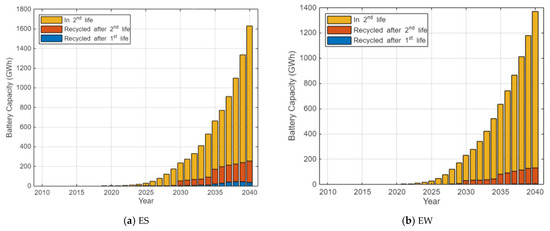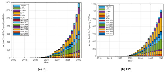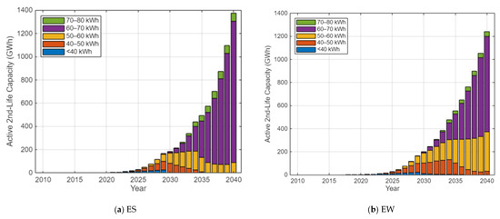 The last figures, Figure 19, Figure 20, Figure 21 and Figure 22, show the annual distribution of the active second-life batteries as a function of their useful capacity, current SoH, age and chemistry. Regarding their capacity, it can be observed that in the ES scenario most of the batteries have a capacity of 60–70 kWh, while after 2036 there are no batteries with a capacity below 50 kWh. It is also noted that after each transition year, batteries with lower capacity are recycled, leaving the ones with a higher SoH and capacity being used in battery energy storage systems. At the other end, the DW scenario is the only one in which batteries below 40 kWh would still be present in 2040. The upside of this scenario is the better use of the full potential of batteries, which equals the improvement of their life cycle assessment and decreasing CO2 emissions per battery. Additionally, the related costs are also lower, requiring fewer replacements within the operating energy storage systems.