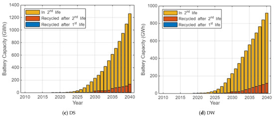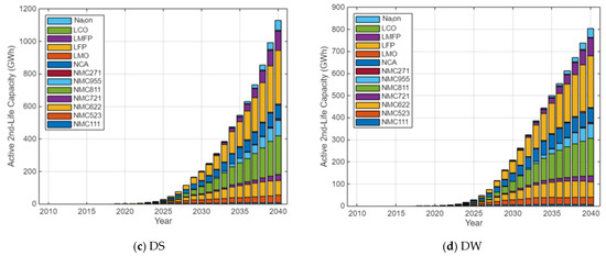 Usable second life capacity by batteries’ chemistry in: (a) ES; (b) EW; (c) DS; (d) DW scenarios.